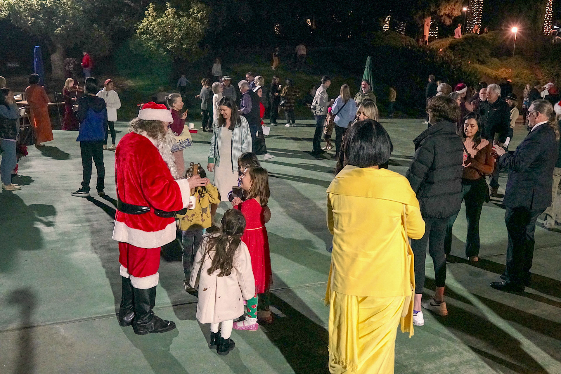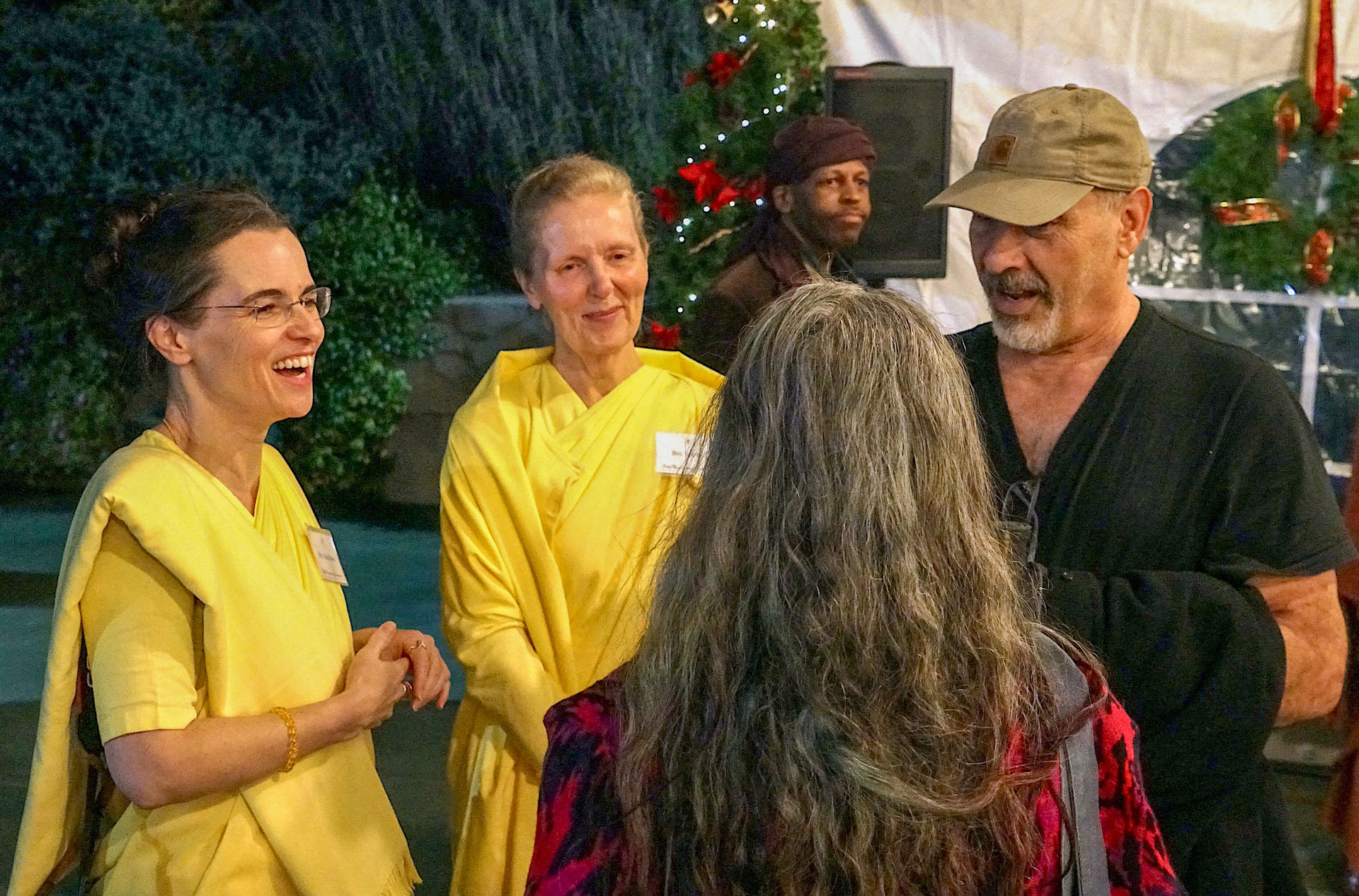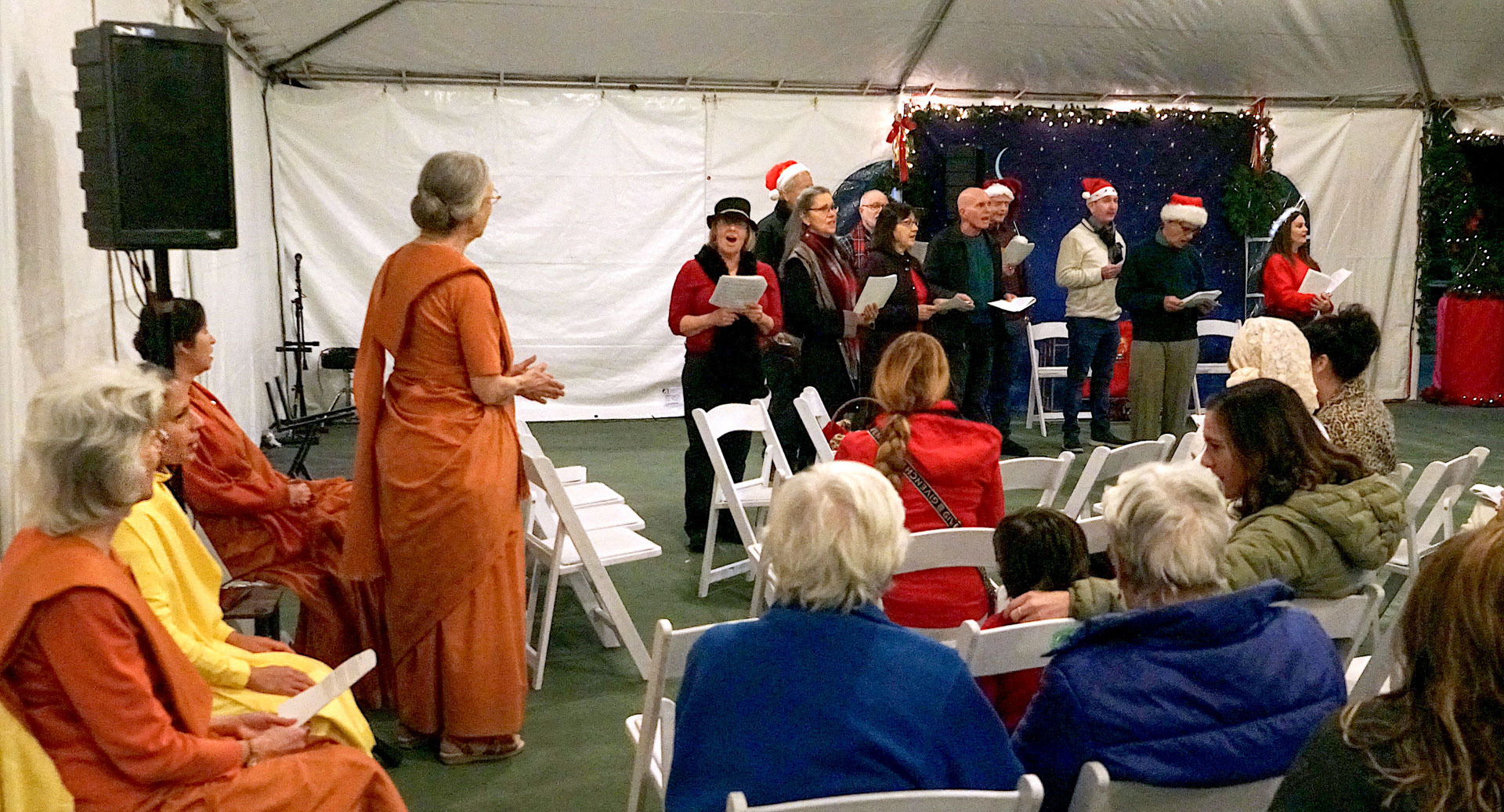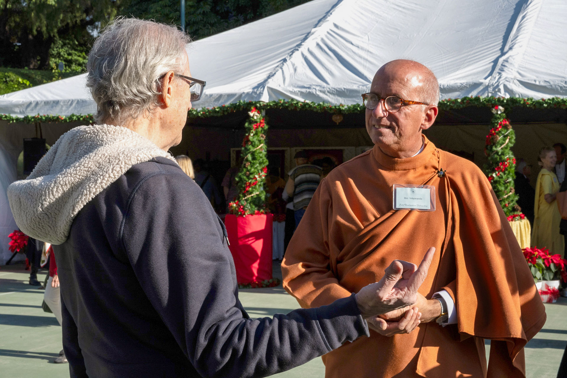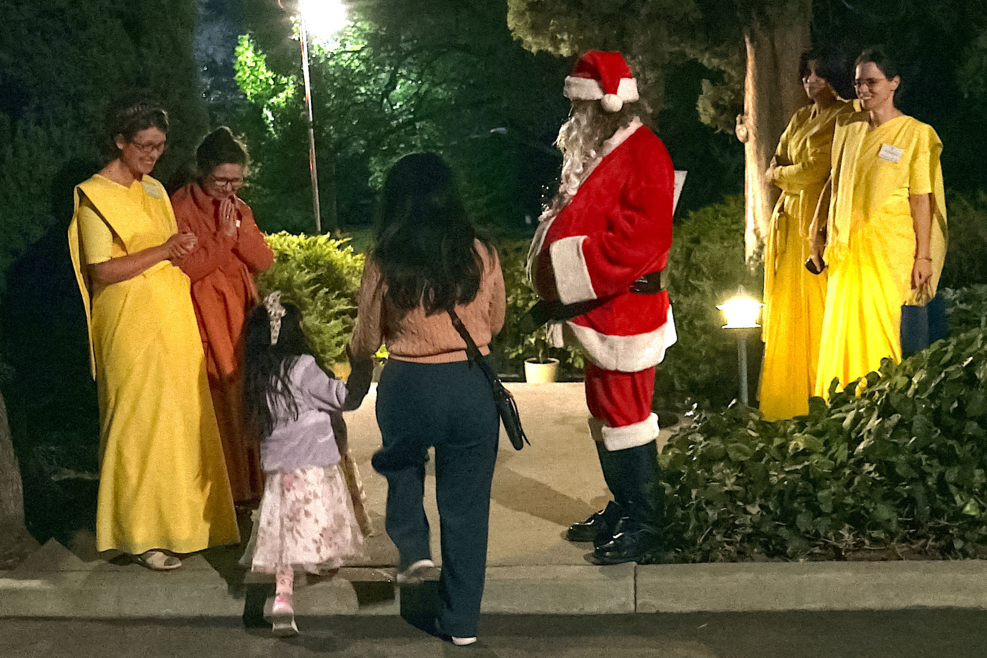 Held on Friday evening, December 6, the festive event drew more than 230 neighbors to the Mother Center, where they were greeted by SRF monks and nuns. Visitors were able to view the many unique decorations in the Reception Hall of the main building, and enjoy visits with Santa Claus and his elf under a decorated tent on the tennis court, where refreshments were offered and carolers uplifted the gathering with Christmas cheer. It was a special joy to share the universal spirit of Christmas with our neighbors.