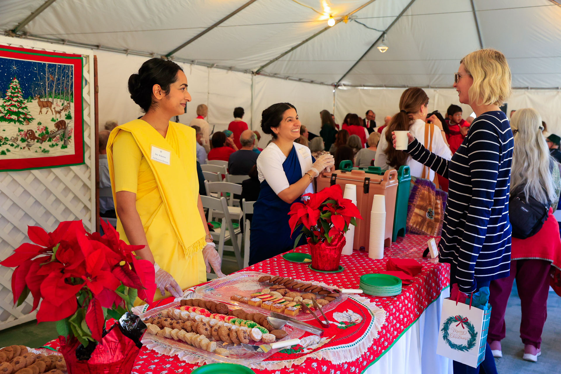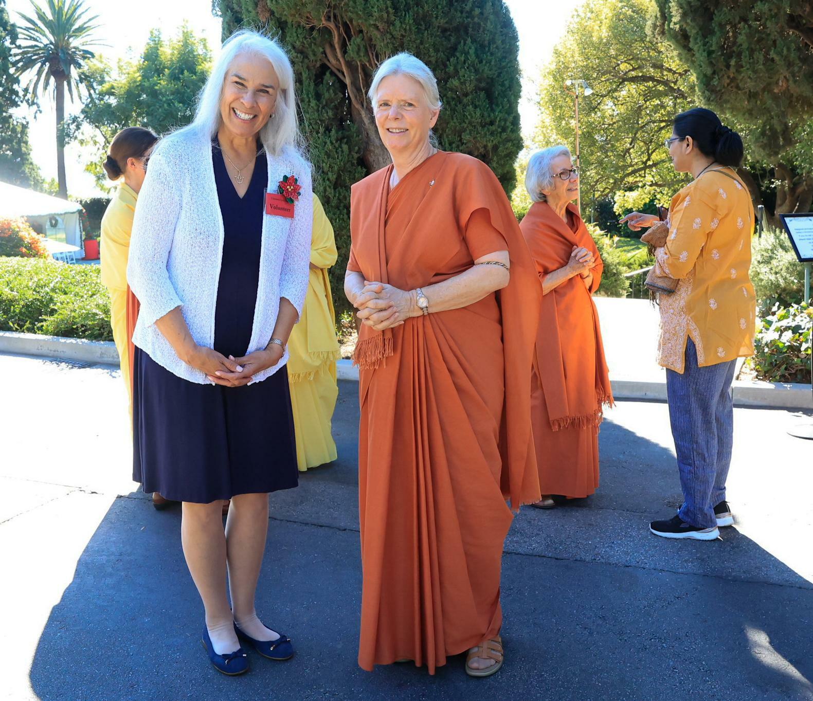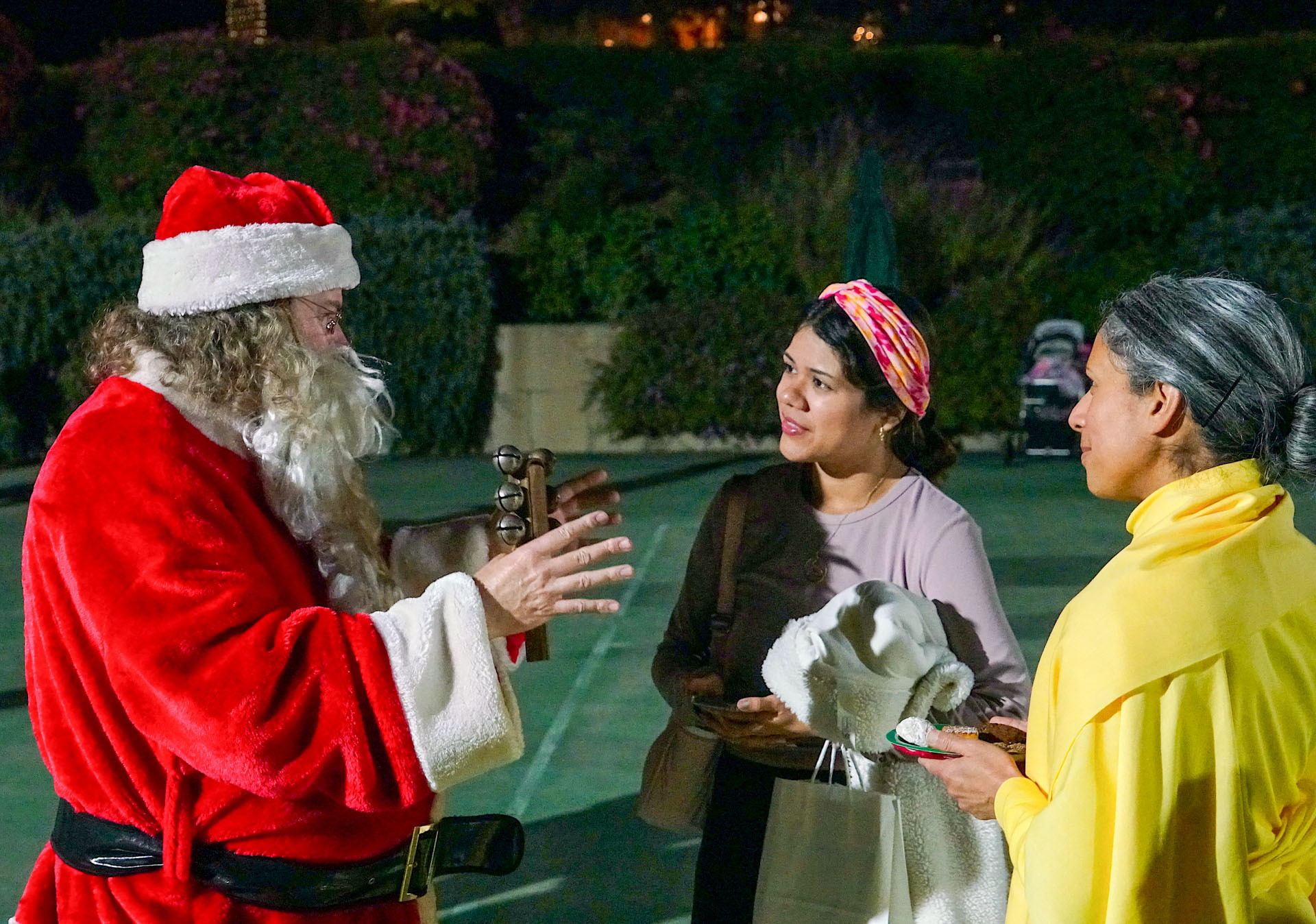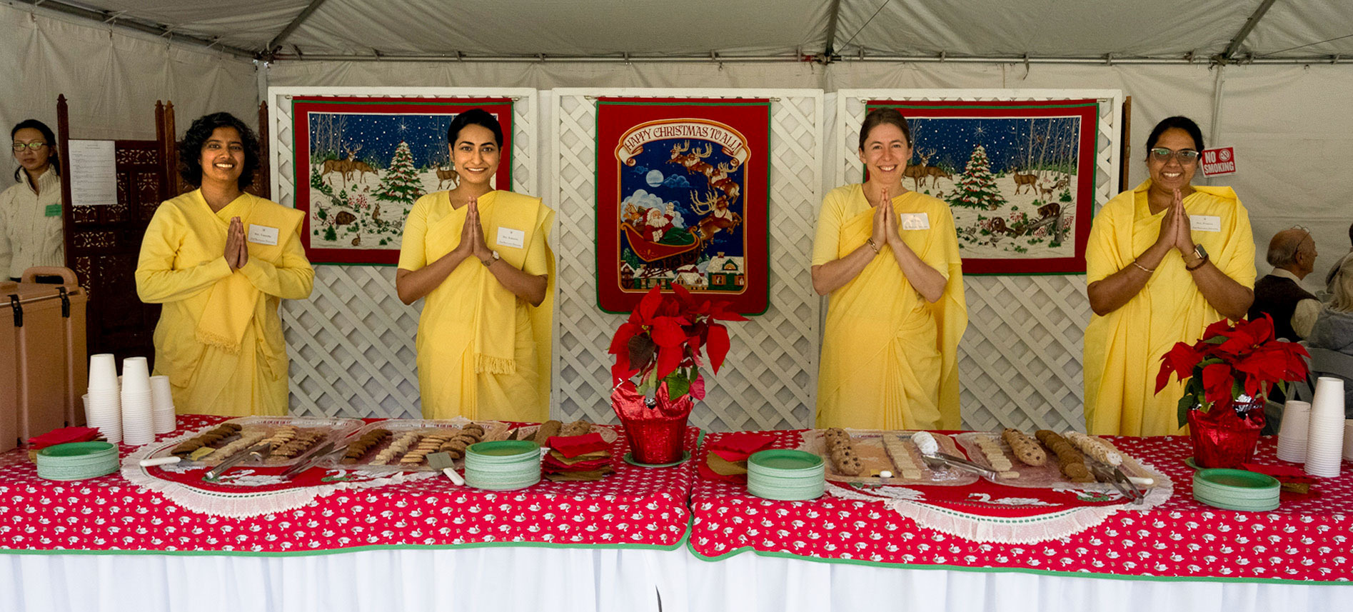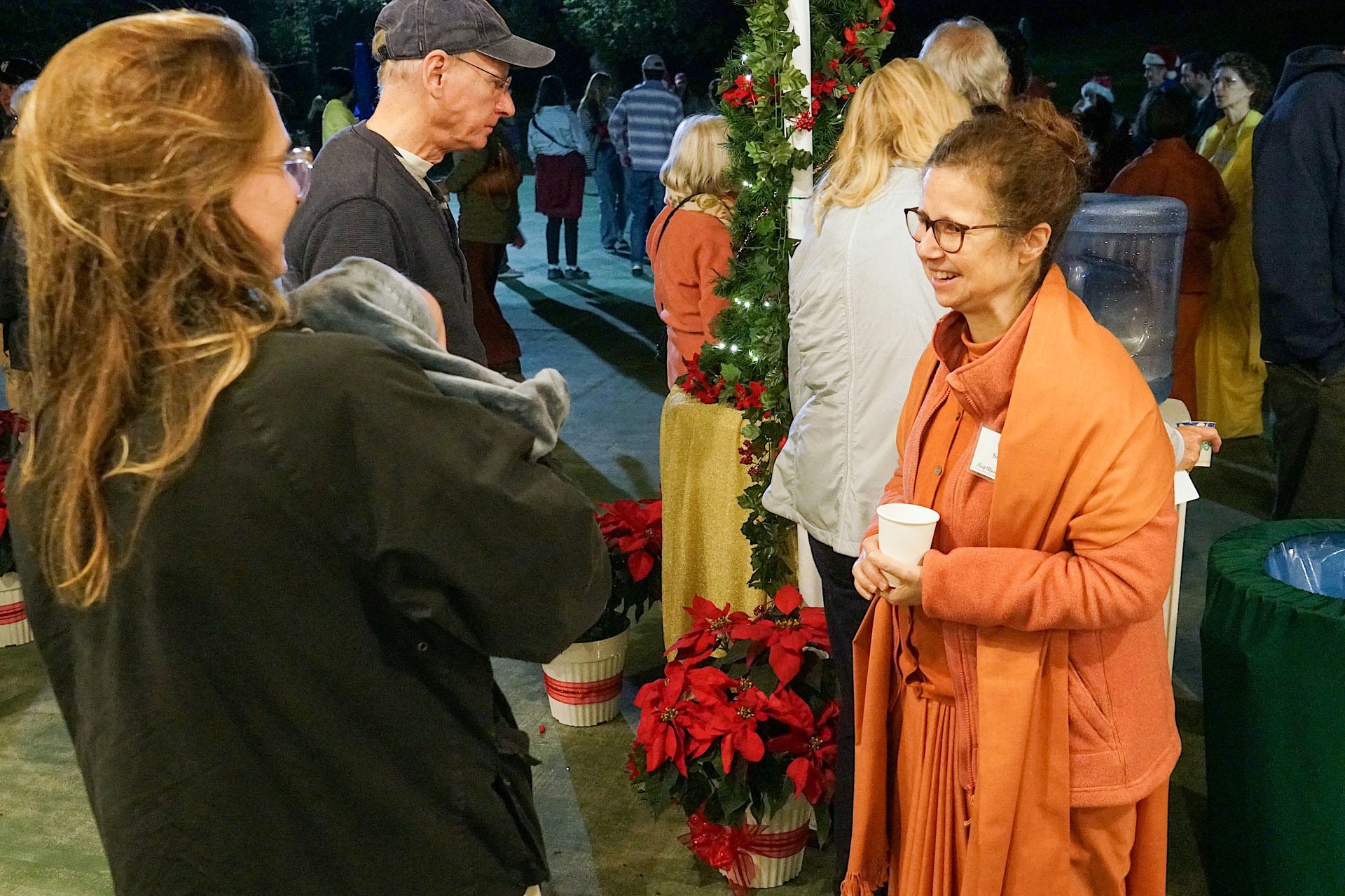 Held on Friday evening, December 6, the festive event drew more than 230 neighbors to the Mother Center, where they were greeted by SRF monks and nuns. Visitors were able to view the many unique decorations in the Reception Hall of the main building, and enjoy visits with Santa Claus and his elf under a decorated tent on the tennis court, where refreshments were offered and carolers uplifted the gathering with Christmas cheer. It was a special joy to share the universal spirit of Christmas with our neighbors.