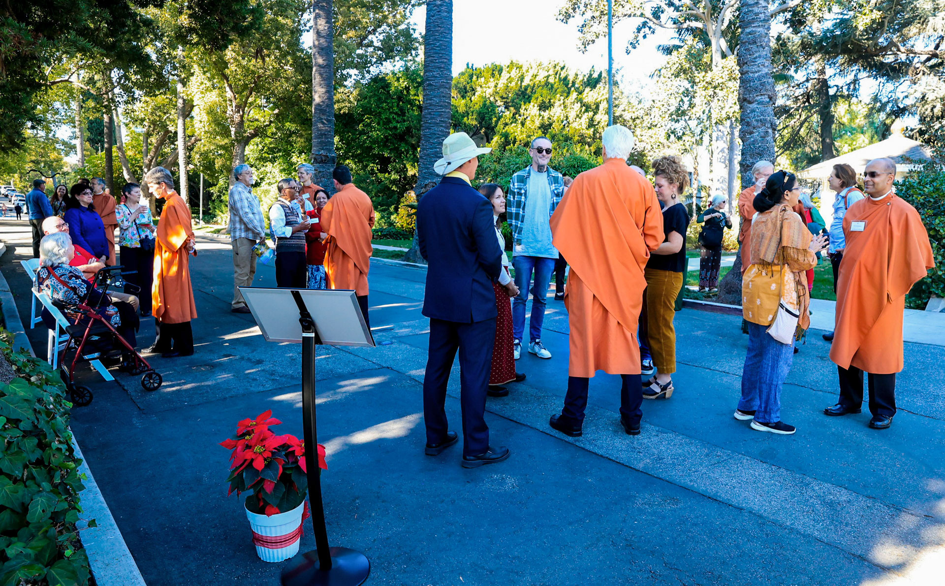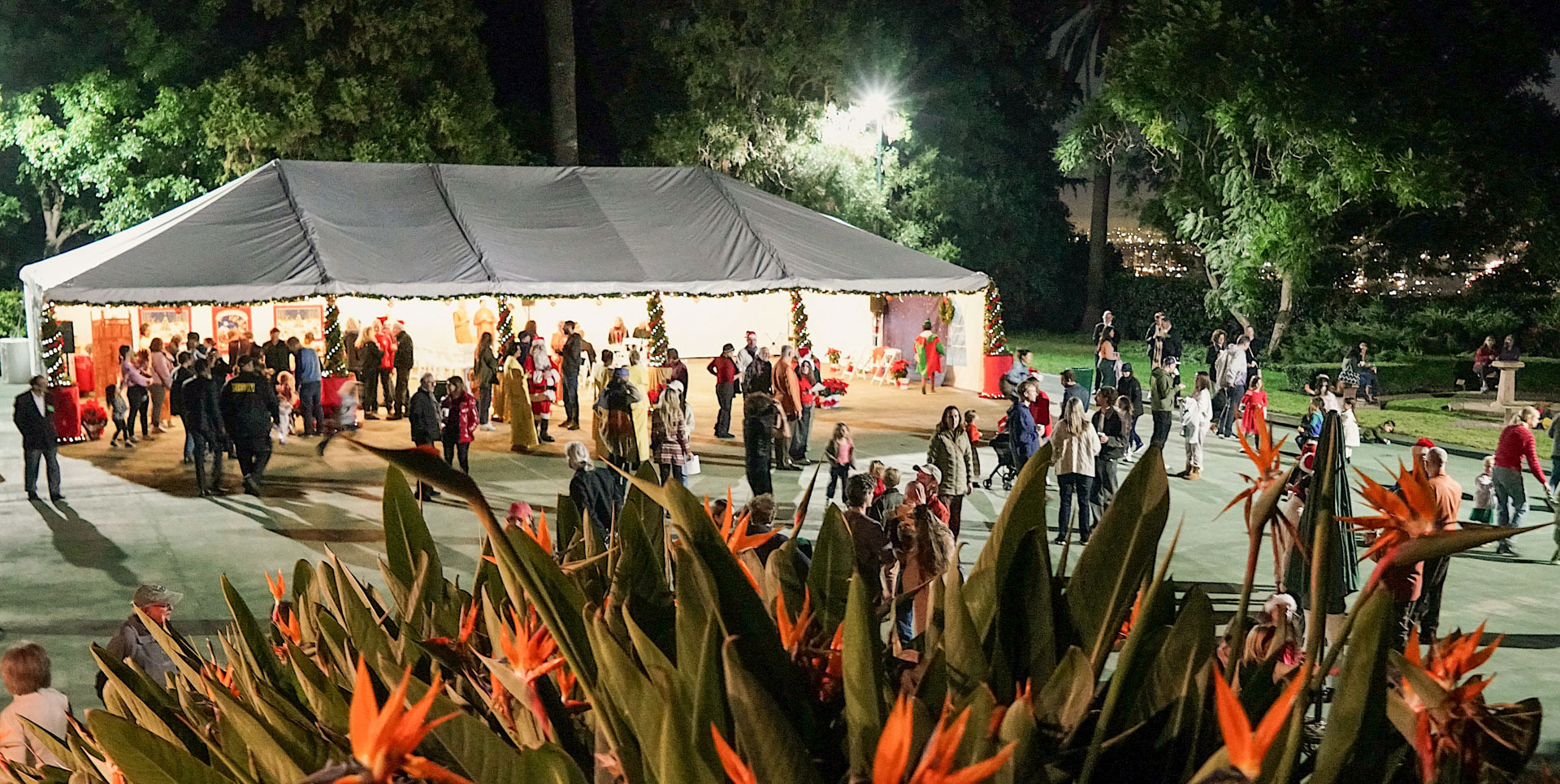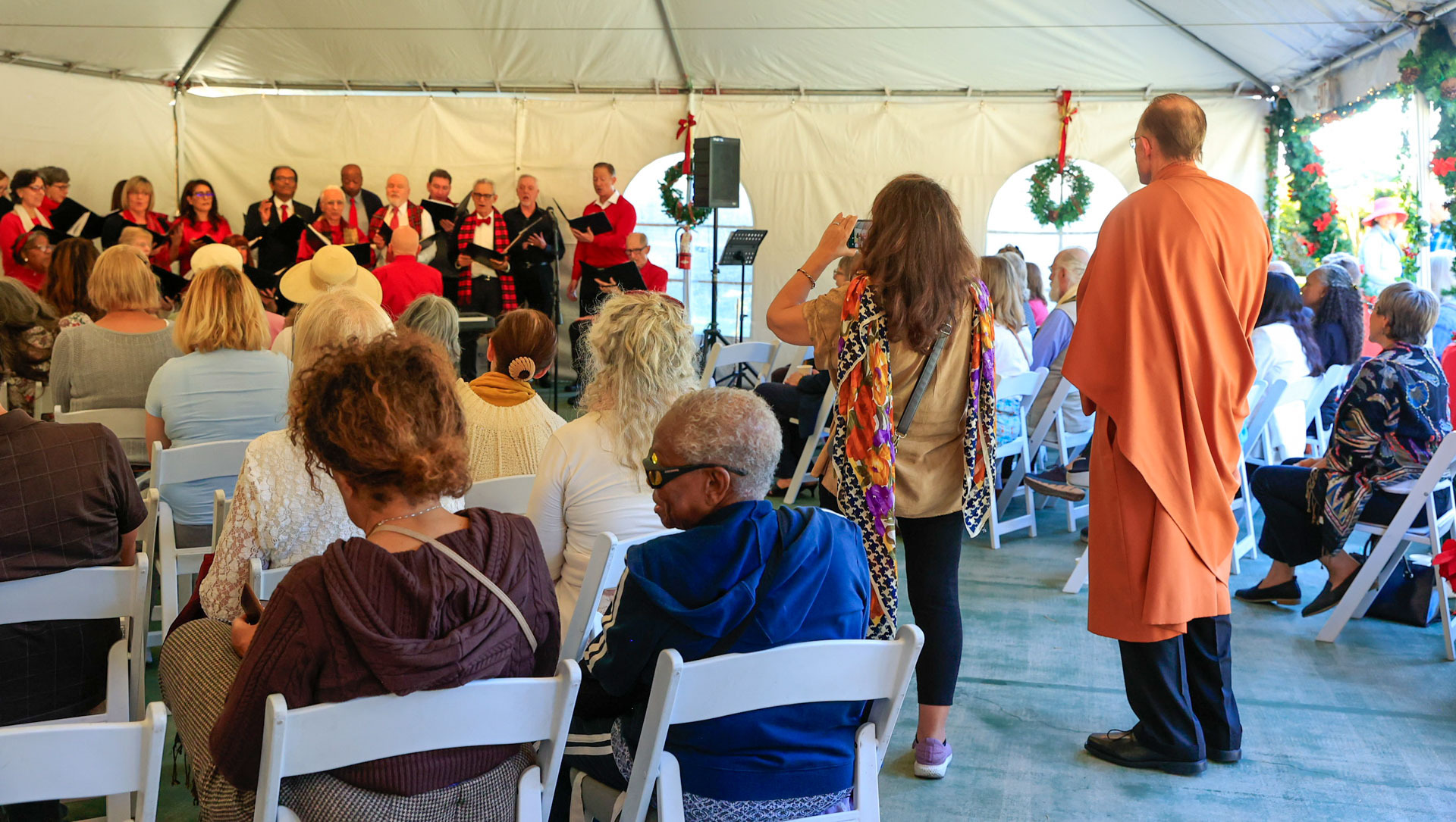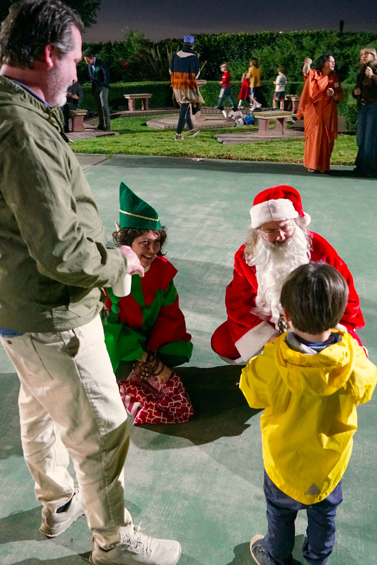 Held on Friday evening, December 6, the festive event drew more than 230 neighbors to the Mother Center, where they were greeted by SRF monks and nuns. Visitors were able to view the many unique decorations in the Reception Hall of the main building, and enjoy visits with Santa Claus and his elf under a decorated tent on the tennis court, where refreshments were offered and carolers uplifted the gathering with Christmas cheer. It was a special joy to share the universal spirit of Christmas with our neighbors.