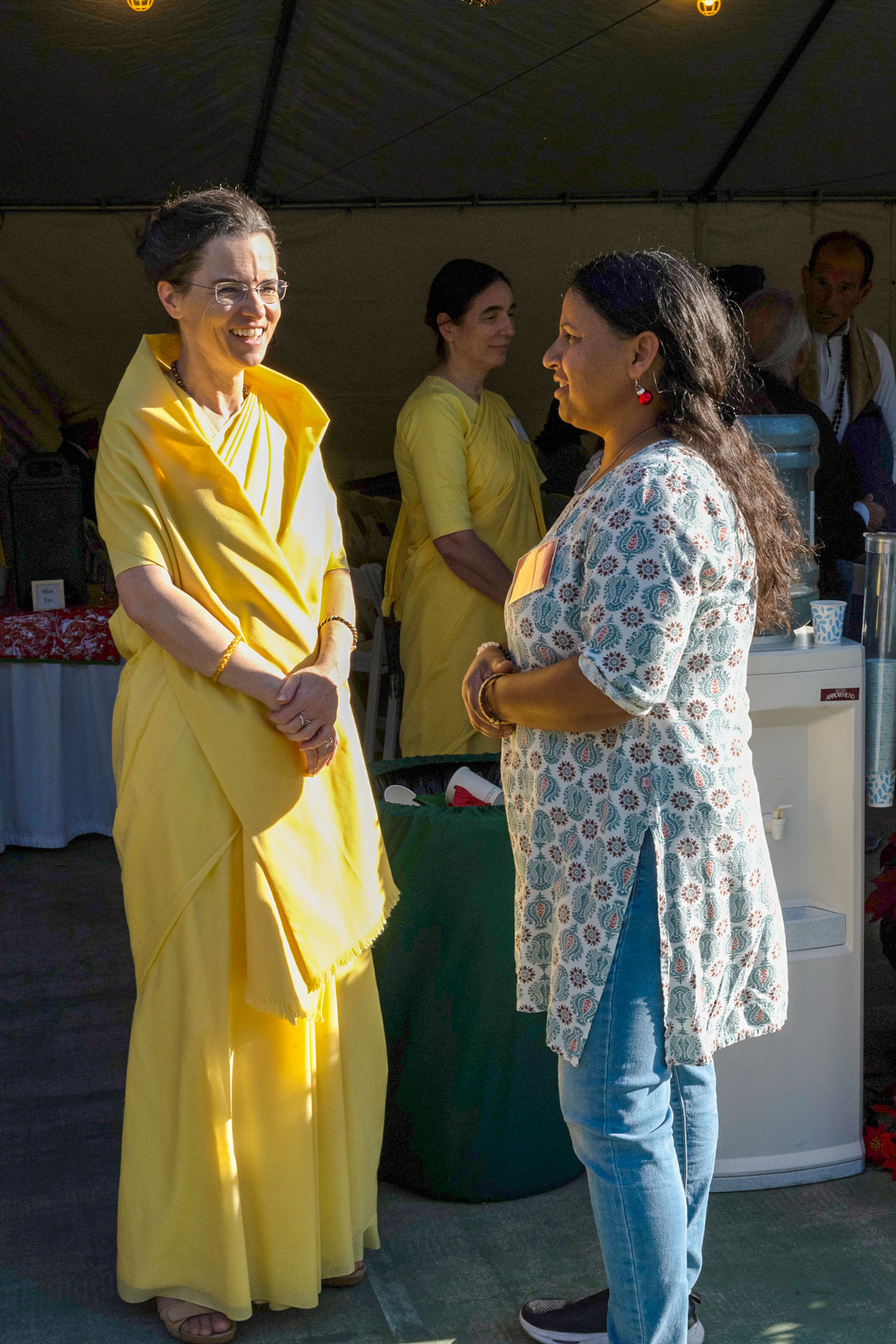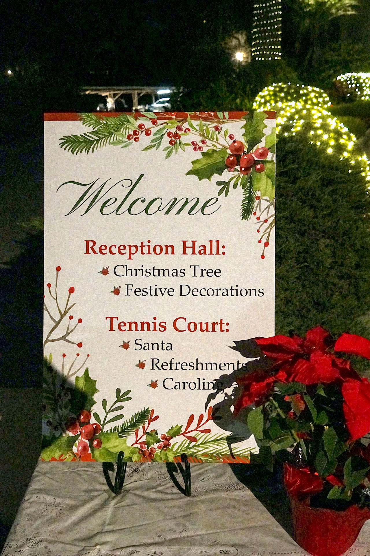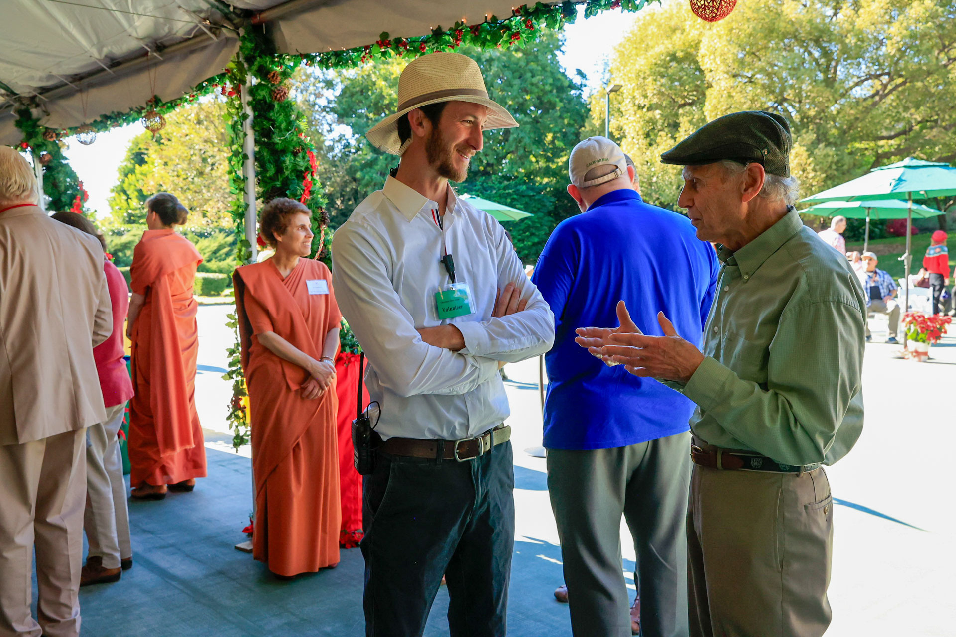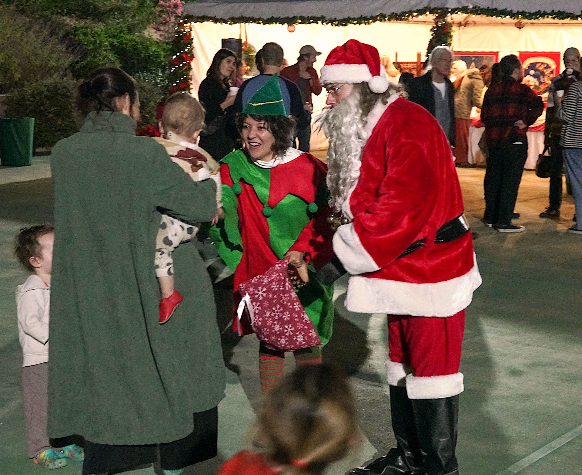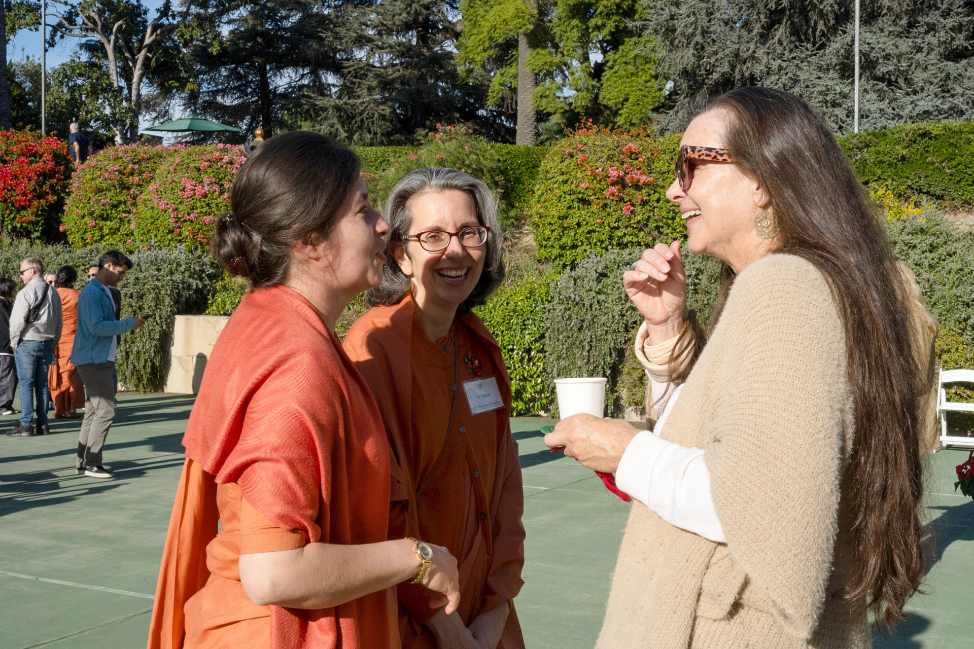 Held on Friday evening, December 6, the festive event drew more than 230 neighbors to the Mother Center, where they were greeted by SRF monks and nuns. Visitors were able to view the many unique decorations in the Reception Hall of the main building, and enjoy visits with Santa Claus and his elf under a decorated tent on the tennis court, where refreshments were offered and carolers uplifted the gathering with Christmas cheer. It was a special joy to share the universal spirit of Christmas with our neighbors.