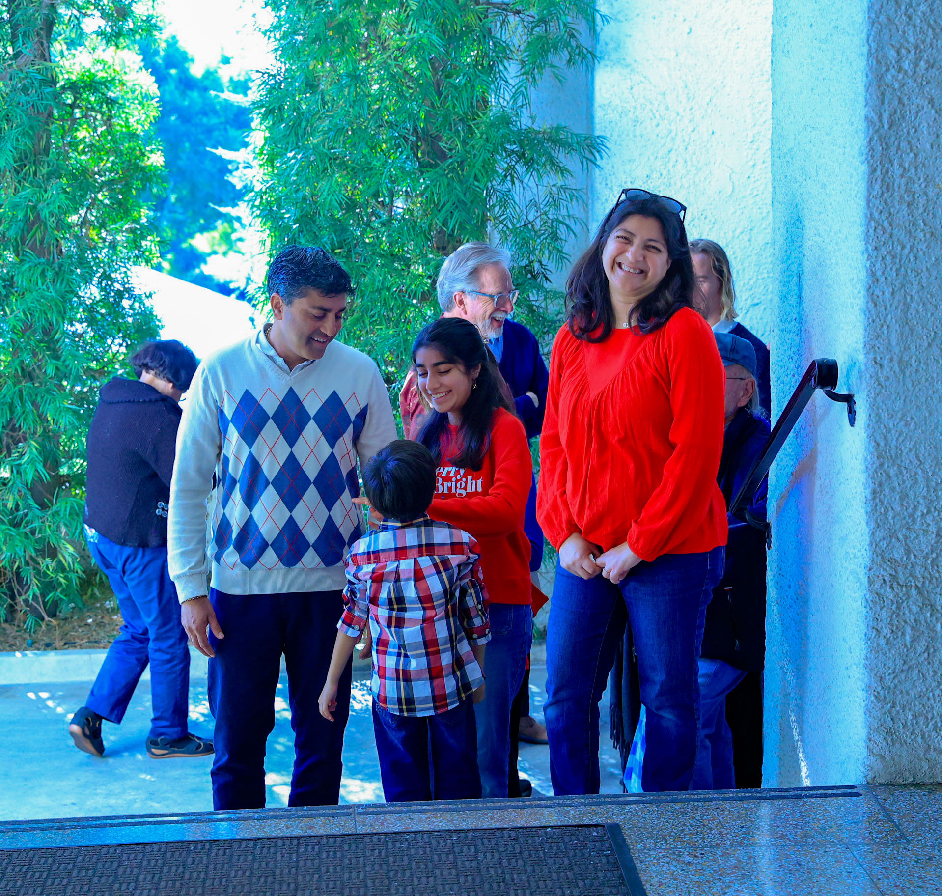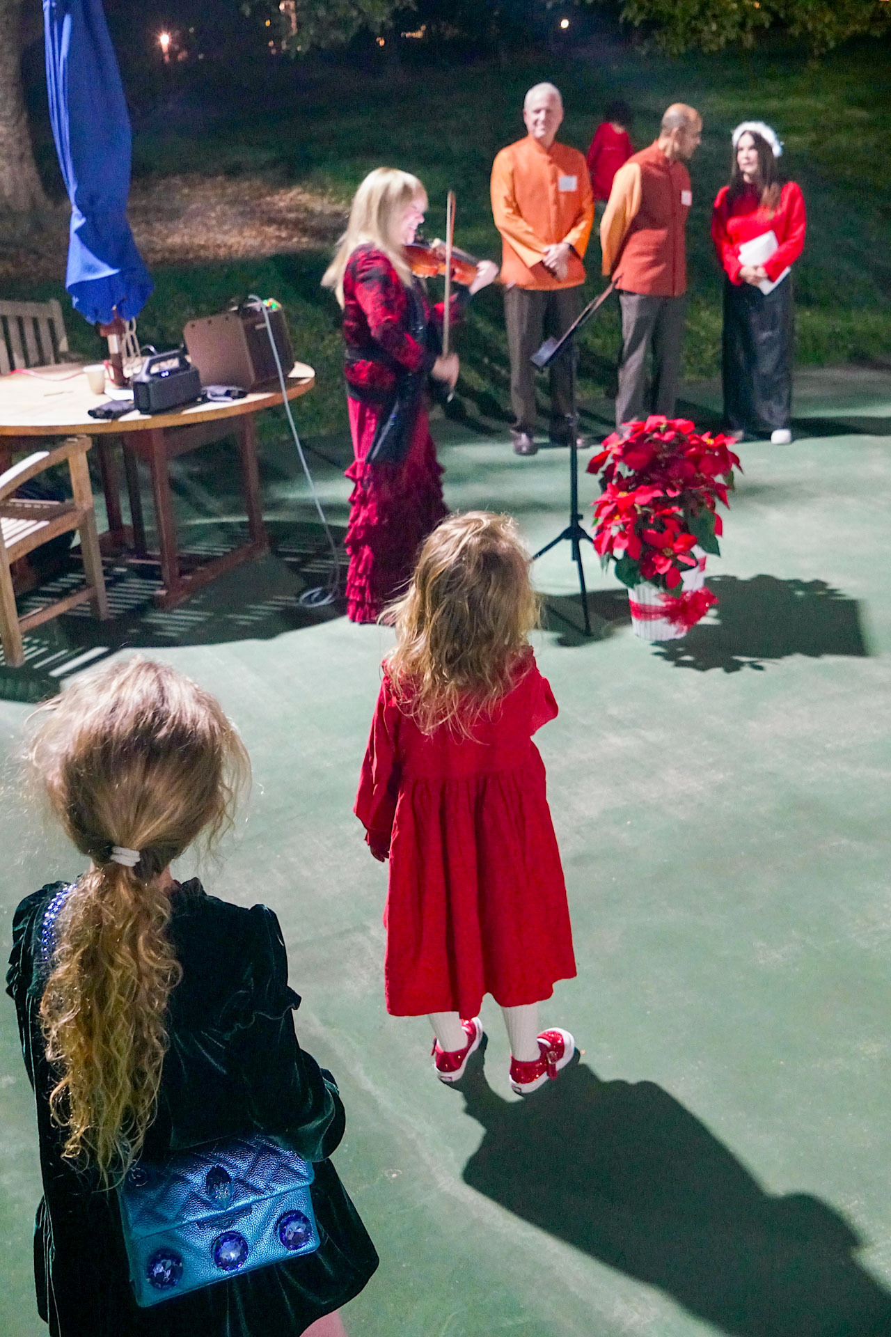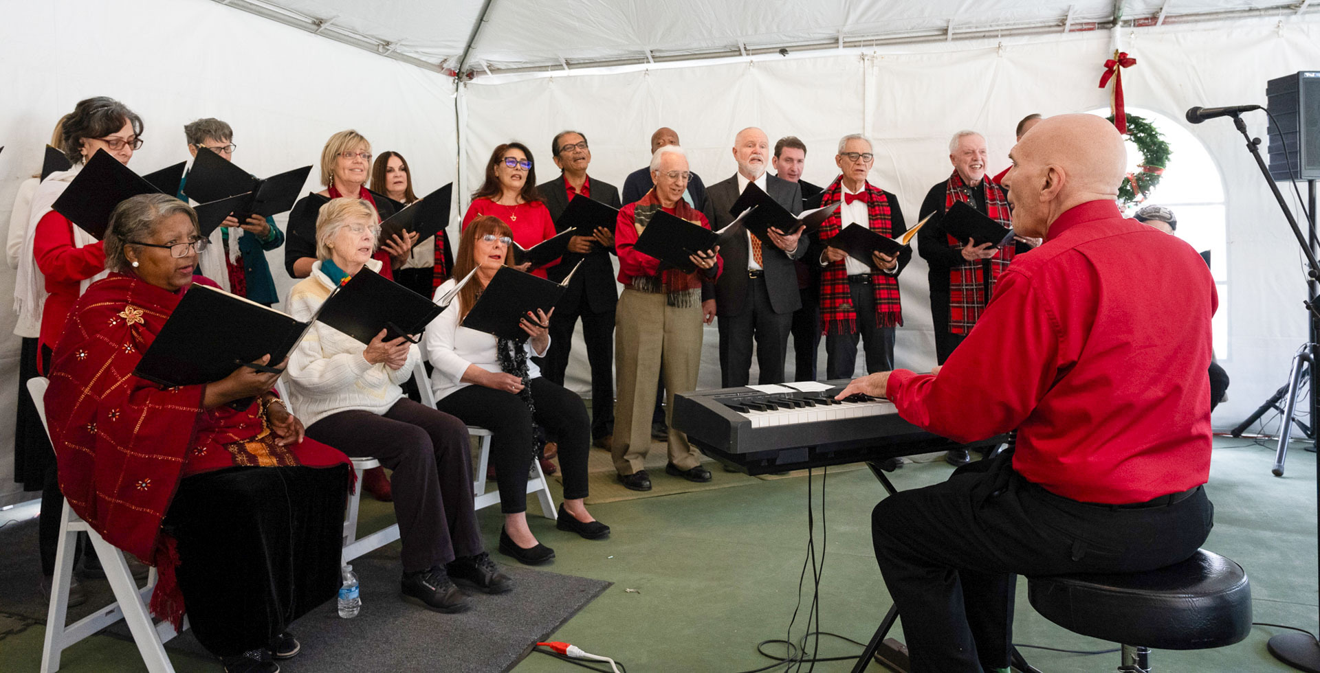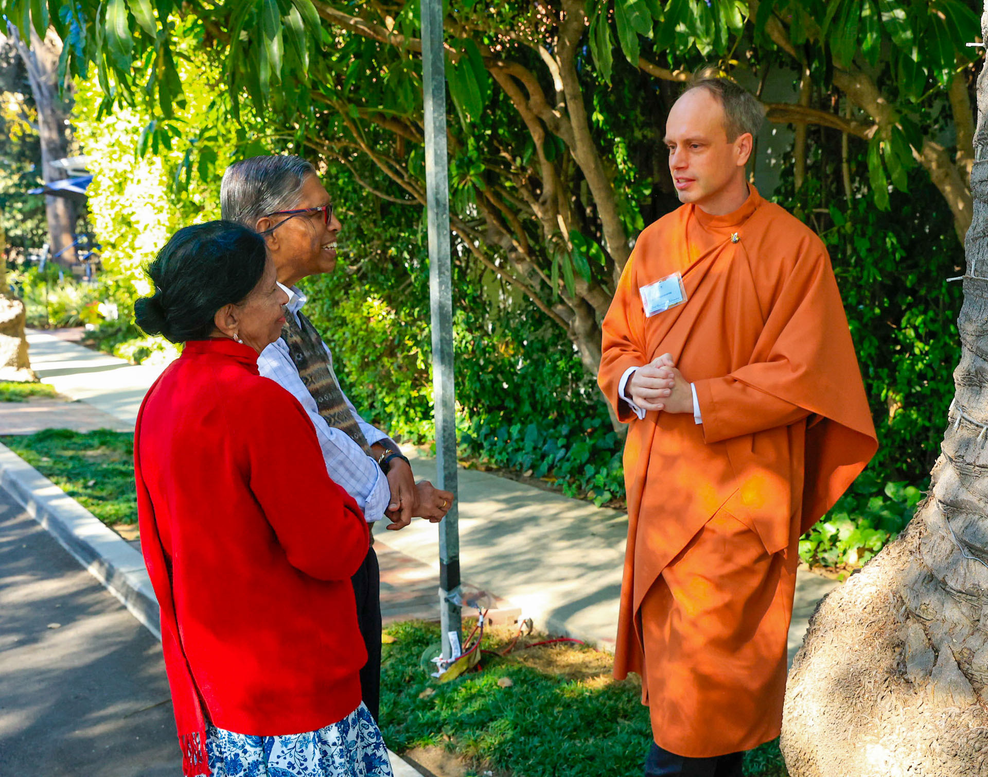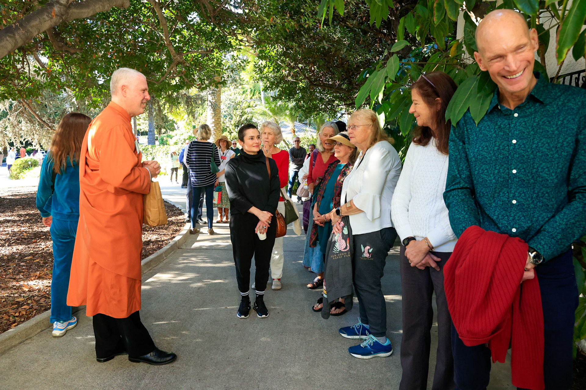Held on Friday evening, December 6, the festive event drew more than 230 neighbors to the Mother Center, where they were greeted by SRF monks and nuns. Visitors were able to view the many unique decorations in the Reception Hall of the main building, and enjoy visits with Santa Claus and his elf under a decorated tent on the tennis court, where refreshments were offered and carolers uplifted the gathering with Christmas cheer. It was a special joy to share the universal spirit of Christmas with our neighbors.