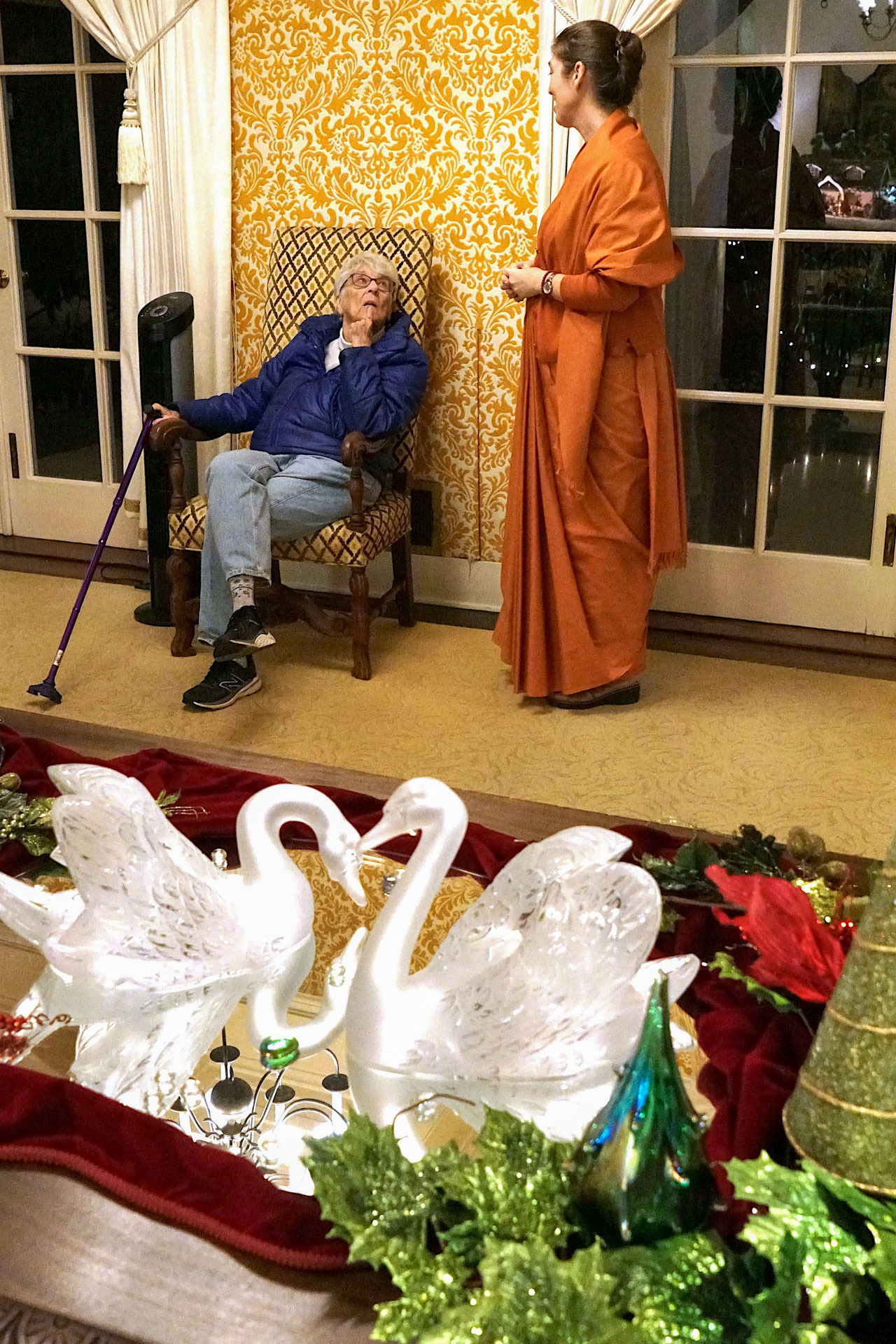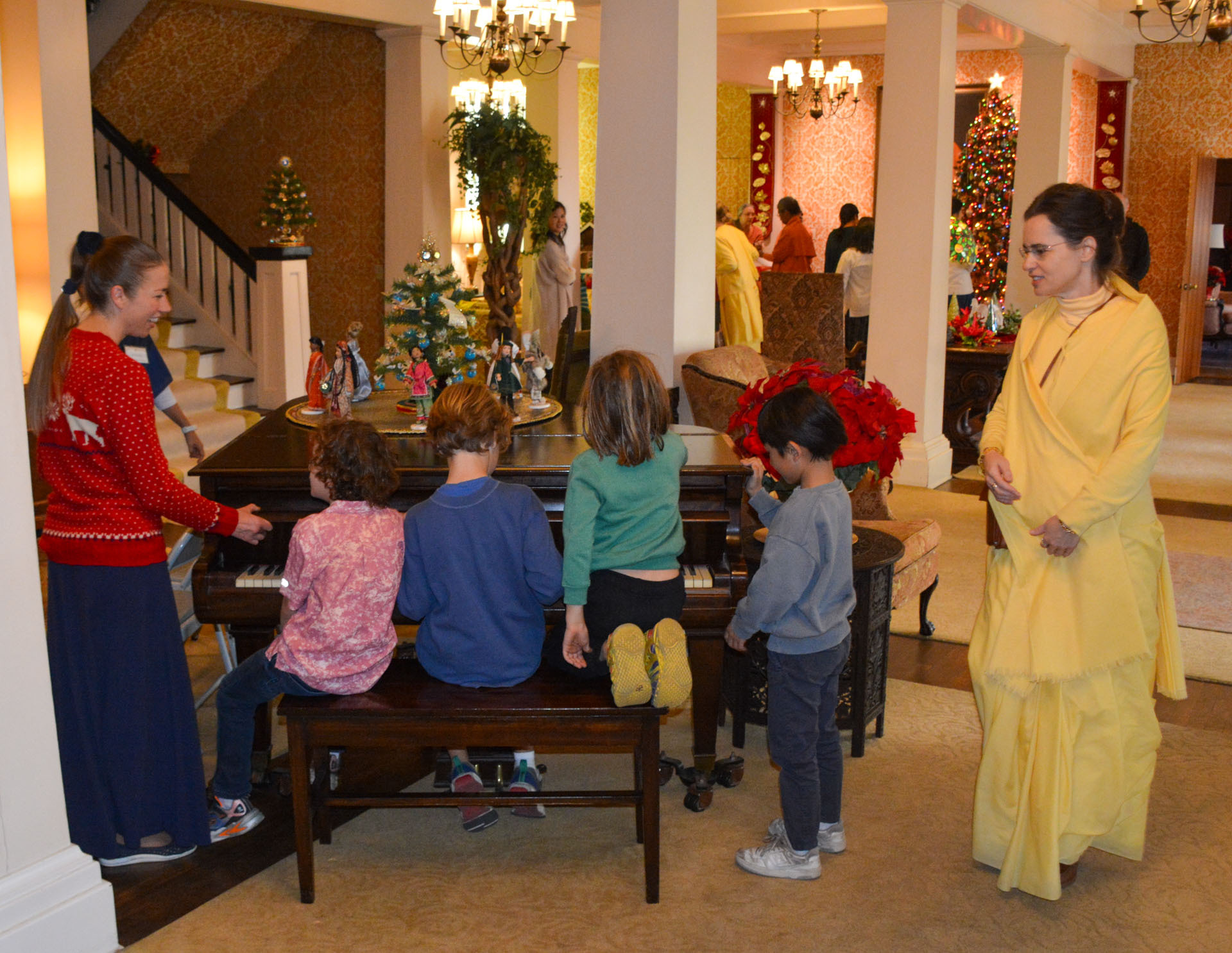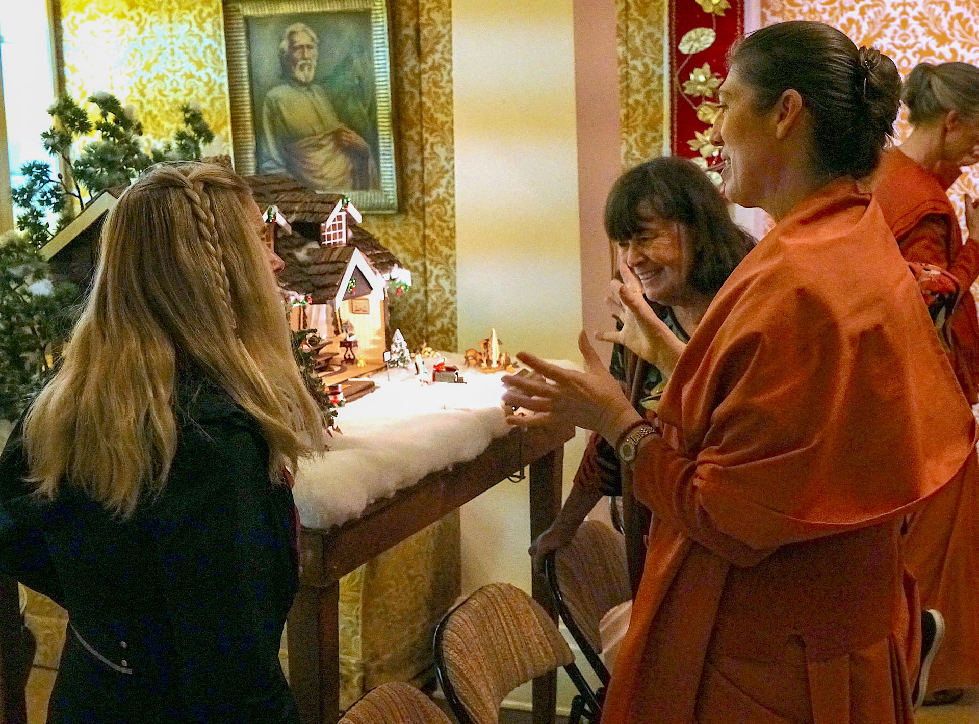 Another joyous tradition is the annual Christmas Open House held at the SRF International Headquarters on Mount Washington in Los Angeles (the Mother Center), which took place December 6 – 8 this year. SRF monks and nuns welcomed members and friends who came from all over California and Arizona to enjoy fellowship and refreshment, view the lovely decorations adorning the glittering Christmas tree, meditate in the chapel where Paramahansaji led many meditations and classes, and hear caroling led by singers from one of the local SRF temples. A highlight each year is the special opportunity to visit Paramahansaji’s living quarters, now preserved as shrine rooms in the International Headquarters Building.