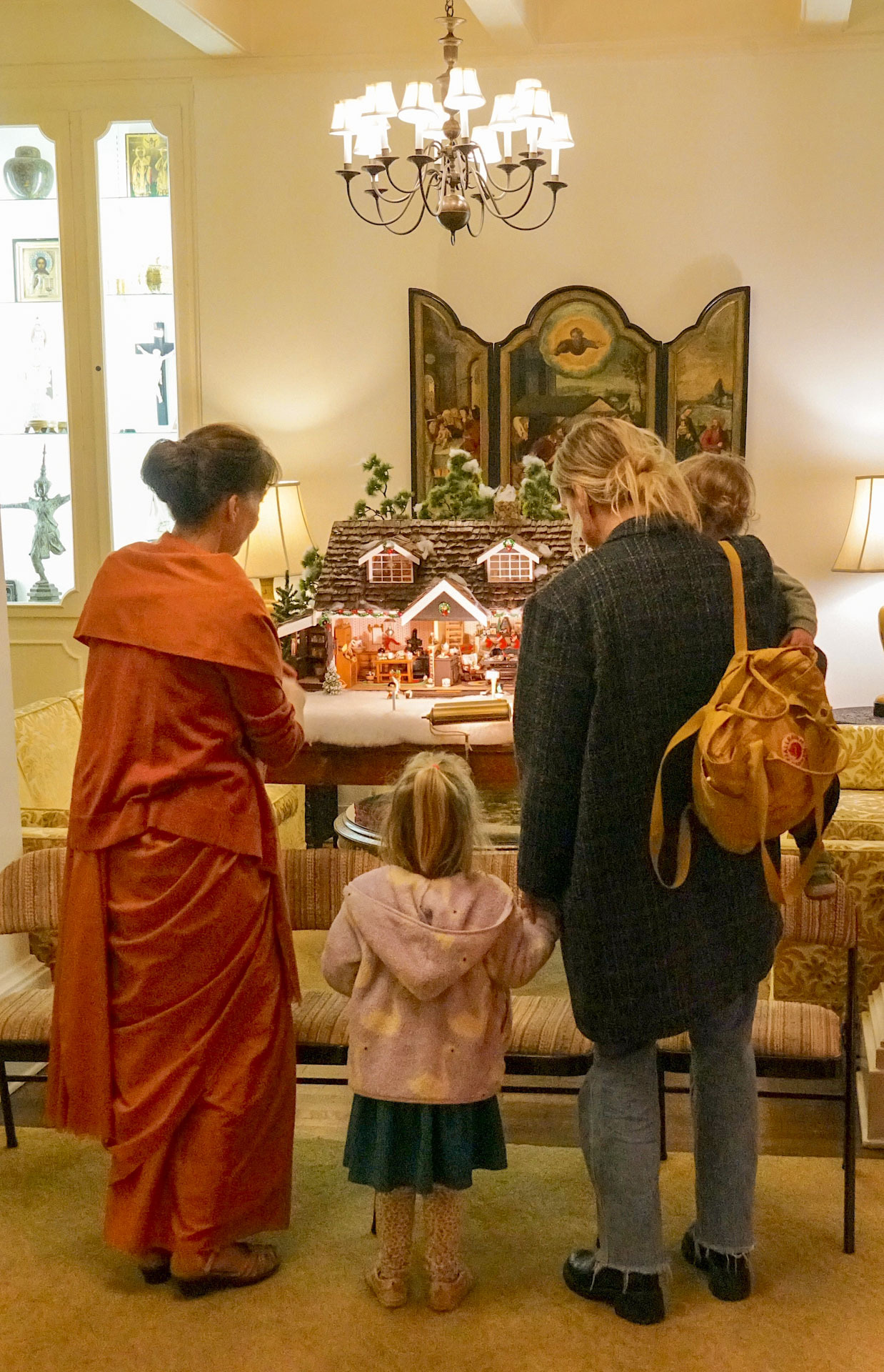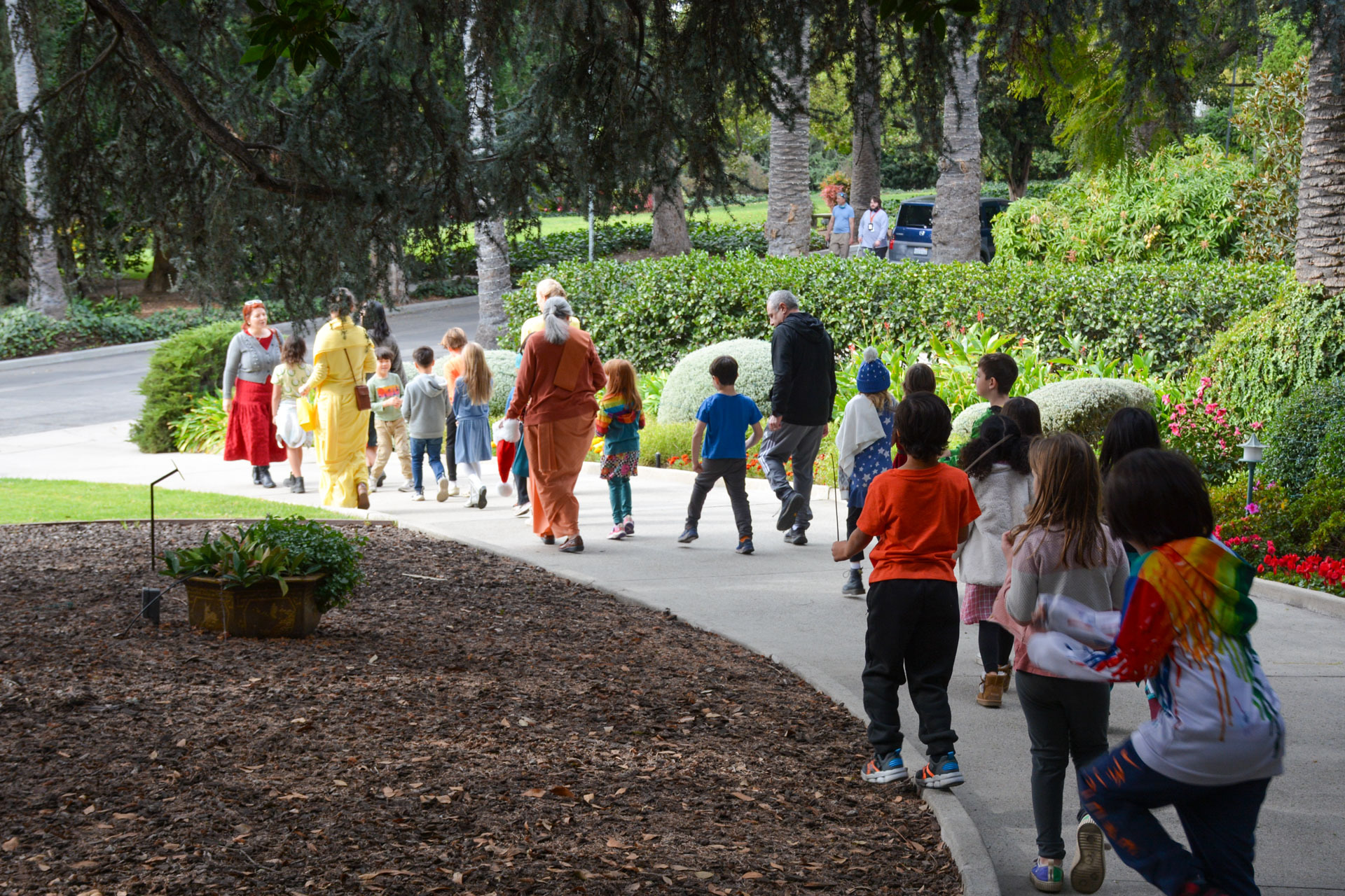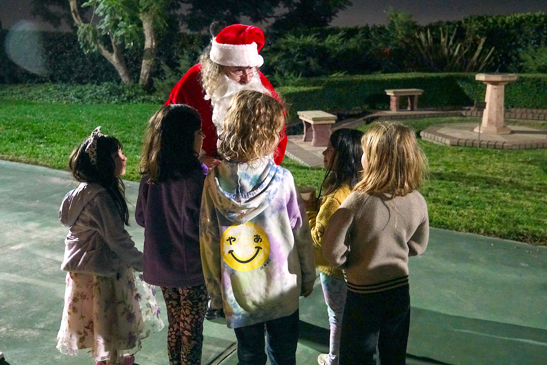 Then on Wednesday, December 11, 46 second graders from the nearby Mt. Washington Elementary School — along with their teachers and volunteer parents — were hosted by monks and nuns for a special tour of the Christmas decorations and caroling inside the main building, as well as exploring the gardens and meeting with Santa Claus on the tennis court.
